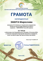 Вітаємо вихованку гуртка "Природа рідного краю" Мирославу ЗАБУГУ з перемогою - І місце у номінації «Кращий літературний твір про крутиголовку звичайну» (керівник гуртка Ганна ГАВРИЛЕНКО).