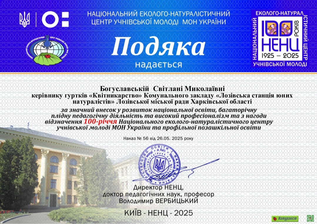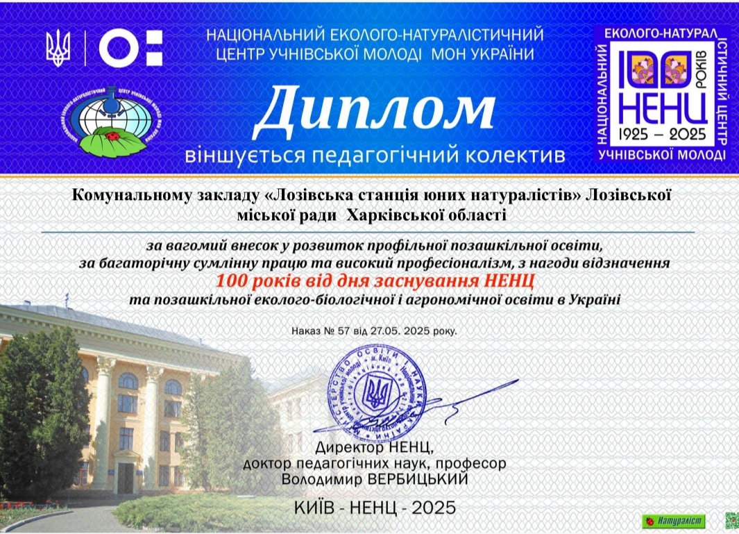 Педагогічний колектив КЗ "Лозівська станція юних натуралістів" отримав ювілейні нагороди з нагоди відзначення 100 років від дня заснування Національного еколого-натуралістичного центру учнівської молоді МОН України та позашкільної еколого-біологічної та агрономічної освіти в Україні за вагомий внесок у розвиток профільної позашкільної освіти, високі досягнення в еколого-натуралістичній роботі, багаторічну плідну працю.